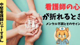 看護師の働き方 看護師の心が折れるとき|メンタル不調とそのサイン みなさん、いつもお疲れさまです!中堅看護師にゃーすまんです!看護師は「命を預かる」責任の重い仕事を担っています。やりがいや誇りがある一方で、心身の疲弊からメンタル不調に陥る人も少なくありません。厚生労働省の調査によると、看護職の約3割が「強... 2025.09.17 看護師の働き方