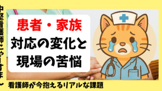 看護師の働き方 患者・家族対応の変化と現場の苦悩|看護師が今抱えるリアルな課題 にゃーすまんみなさん、いつもお疲れさまです!中堅看護師にゃーすまんです!「前より患者さんやご家族の要求が厳しくなっていない?」看護の現場において患者やその家族の対応に困った経験がない人の方が少ないと思います。優しい感謝の言葉をいただく一方で... 2025.09.06 看護師の働き方